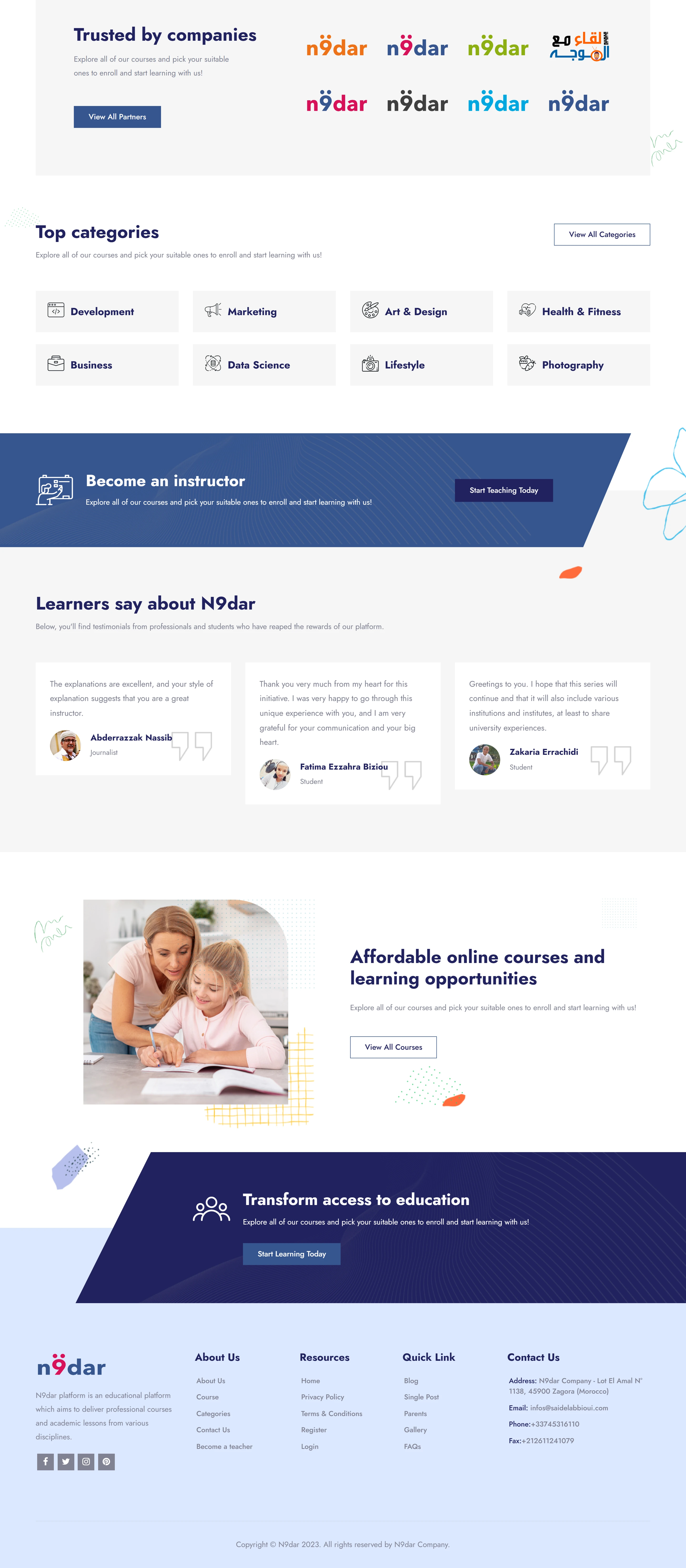Collaborated with N9dar, a Morocco-based company, to enhance their Learning Management System (LMS) by resolving critical issues in their Moodle platform. The project involved diagnosing and fixing errors, ensuring the platform's stability, and deploying a customized Moodle template that aligns with N9dar's branding and educational objectives. The result was a fully optimized and user-friendly LMS tailored to support their learning initiatives effectively.